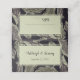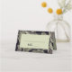 Un côté de ce design moderne élégant comprend les noms de la mariée et du marié et la date mariage en écriture noire et texte serif sur un arrière - plan rectangulaire vert, bordé par un motif de feuillage tropical luxuriant en vert sur noir. L'autre côté, avec une bordure de feuillage tropical assortie, offre un espace rectangulaire vert pour écrire les noms des invités mariages et leurs numéros de table.