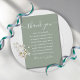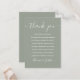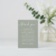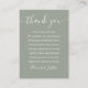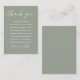 Un élégant carton de remerciement pour réception de mariage. Personnalisé avec votre message de remerciement spécial dans une typographie élégante sur un fond argent sage. Vous pouvez personnaliser le fond à votre couleur de thème de mariage préférée. Un remerciement spécial pour vos invités. Conçu par Thisisnotme©