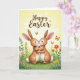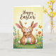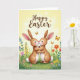 Cette carte présente deux personnages aux longues oreilles ressemblant à des lapins, de couleur brun chaud et blanc crème, debout l'un près de l'autre au centre, le nez se touchant et les yeux fermés 🐰. Un léger rougissement rosé sur leurs joues et la courbe douce de leurs pattes entrelacées suggèrent un lien doux, comme celui de proches amis ou d'un couple aimant. Autour d'eux s'étend une prairie printanière remplie de petites fleurs sauvages bleues, jaunes, roses et orange dispersées sur une herbe verte riche 🌷. Le ciel au-dessus se dégrade en une lueur jaune doux, donnant à la scène une apparence ensoleillée et de début de matinée. Près du haut, un vœu saisonnier apparaît en lettrage brun cacao profond et fluide, espacé de manière à se détacher clairement au-dessus du couple. Des formes florales blanches légères flottent en arrière-plan, ajoutant de la
