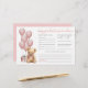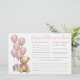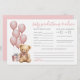 Cette carte horizontale de prédictions et conseils pour bébés présente un thème d'ours en peluche doux et ludique, parfait pour une célébration baby shower douce. Le côté gauche de la carte présente un adorable ours en peluche couleur aquarelle portant un arc rose, assis à côté d'un ballon rose et d'une petite boîte cadeau, ajoutant une touche de charme et de douceur à l'aménagement. La palette de couleurs utilise des tons rose et gris, avec du texte dans un mélange de calligraphie manuscrite et de polices serif classiques pour un look mignon mais classique. Le style général est minimaliste et élégant, en gardant l'accent sur les oeuvres d'art sucrées et les réponses des clients. Les invités sont invités à remplir leurs prédictions pour bébé - comme la date d'arrivée, l'heure, le poids, les cheveux et la couleur des yeux, et à qui ressemblera le bébé. En bas, il y a de la place pour partager des conseils pour les parents à devenir et signer leur nom. Le dos est doté d’un arrière - plan rose coordonnant, mais peut être changé en n’importe quelle couleur pour correspondre au thème de votre soirée. Entièrement personnalisable, cette carte ajoute un élément fantaisiste et chaleureux à votre baby shower. Il s’agit d’une combinaison parfaite pour un thème "We Can Bearly Wait" ou toute célébration inspirée de l’ours en peluche.