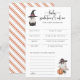 Préparez-vous pour une fête prénatale "spooktacular" d'Halloween ! Rendez l'arrivée de votre Petit Fantôme spéciale avec notre carte de prédictions personnalisée pour bébé Halloween. Célébrez avec un design unique et personnalisé qui présente le charme de dessins aquarelles peints à la main de fantômes effrayants, de jolies araignées, de citrouilles fantaisistes et de feuilles d'orange brûlées automnales, mêlant sans effort la joie de l'arrivée d'un nouveau bébé à l'esprit amusant d'Halloween. Commandez maintenant et commencez vos célébrations d'Halloween de la plus belle façon !