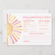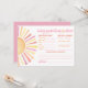 Cette carte horizontale de prédictions et de conseils pour bébé présente un design lumineux et joyeux sur le thème du soleil. Sur le côté gauche, un grand soleil avec des rayons vibrants dans des tons classiques de jaune, d'orange et de rouge ajoute une touche chaleureuse et ludique. Sur la droite, la carte invite les invités à remplir leurs meilleures suppositions pour l'arrivée du bébé, y compris la date, l'heure, le poids, la couleur des yeux, la couleur des cheveux et à qui le bébé ressemblera.