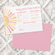 Cette carte horizontale de prédictions et de conseils pour bébé présente un design lumineux et joyeux sur le thème du soleil. Sur le côté gauche, un grand soleil avec des rayons vibrants dans des tons classiques de jaune, d'orange et de rouge ajoute une touche chaleureuse et ludique. Sur la droite, la carte invite les invités à remplir leurs meilleures suppositions pour l'arrivée du bébé, y compris la date, l'heure, le poids, la couleur des yeux, la couleur des cheveux et à qui le bébé ressemblera.