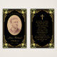 Carte de prière commémorative à air vintage pour un enterrement. De part et d'autre, il est noir et possède un cadre baroque vintage or élégant. Sur le devant, il y a une photo ovale vintage avec bordure dorée et texte doré sous elle. Le nom est écrit dans un élégant script calligraphique. Au fond, il y a une prière, en casquette doré, avec une croix dorée au-dessus. Les décorations vintages du cadre, le cadre ovale de la photo et la croix sur le dos sont de la fausse feuille d'or. L'arrière - plan avec ses élégantes décorations baroques d'or sur reliure en cuir bleu est tiré d'une reliure vintage de couverture de livre français, par Georges Mercier (1885-1939) - Madame de Maupin par Teophile Gautier, volume 1, édition 1911, Paris - maintenant dans le domaine public, de la Bibliothèque publique de New York. L'espace réservé, un vieux portrait sépia d'un jeune homme de 1882, est dans le domaine public ; il a été offert par Jody LaGreca sur Public Domain Pictures.