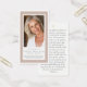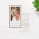 Ces cartes de prière photo de taille porte-monnaie sont faciles à porter dans un porte-monnaie ou un porte-monnaie, ce qui en fait un souvenir attentionné pour les amis et la famille qui assistent à des funérailles, à un service commémoratif ou à une célébration de la vie. Cette carte a été conçue avec le Psaume vingt-trois, mais vous pouvez la changer en une autre prière ou poème en utilisant le bouton Personnaliser. La photographie est illustrative et peut être changée en une de vos propres photos.