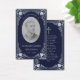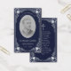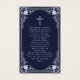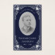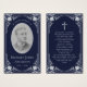 Carte de prière commémorative à air vintage pour les funérailles, recommandée pour utilisation avec une photo en noir et blanc. De part et d'autre, il est bleu marine et possède un cadre élégant baroque vintage imitation argent. Sur le devant, il y a une photo vintage ovale en noir et blanc avec une bordure en faux argent et du texte au-dessus et au-dessous. Les mots "dans la mémoire aimante" sont placés au-dessus de la photo. Au fond, il y a une prière, en casquette, avec une fausse croix argentée au-dessus. Le texte est gris clair, presque blanc. L'arrière - plan avec ses élégantes décorations baroques d'or sur reliure en cuir bleu est tiré d'une reliure vintage de couverture de livre français, par Georges Mercier (1885-1939) - Madame de Maupin par Teophile Gautier, volume 1, édition 1911, Paris - maintenant dans le domaine public, de la Bibliothèque publique de New York. L'espace réservé, un vieux portrait sépia d'un jeune homme de 1882, est dans le domaine public ; il a été offert par Jody LaGreca sur Public Domain Pictures.