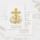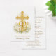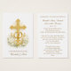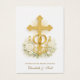 Célébrez le sacrement de saint mariage avec cette élégante carte de prière de mariage catholique. Elle présente une croix dorée radieuse entrelacée d'anneaux de mariage et de volutes ornées accentuées de roses blanches. Le recto porte l'inscription « Unis dans le cœur de Jésus » au-dessus des noms de la mariée et du marié. À l'intérieur, une bénédiction nuptiale révérencieuse invoque la grâce de Dieu et l'intercession de la Bienheureuse Vierge Marie. Un beau souvenir pour le jour du mariage, parfait pour les invités catholiques, les faveurs de prière ou un livre de dévotion de la mariée.