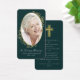 Un hommage élégant et réfléchi à un être cher. Un cadre ovale féminin et orné d'or encadre la photo de la personne décédée. Trois lignes de texte ci-dessous vous permettent de le personnaliser. J'ai choisi dans Loving Memory, leur nom et leurs dates de vie. Une belle croix dorée brillante se trouve sur le dessus du dos. Ci-dessous, il y a de l'espace pour une prière, un psaume ou un poème. L'arrière - plan est vert émeraude foncé.