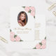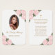 Elégante carte de mémoire florale rose et or/carte de prière funéraire avec une photo ornée de roses d'aquarelle rose vif et de fleurs d'haleine de bébé sur un arrière - plan blanc clair.