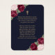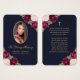 Belle carte de mémoire florale bleu et or/carte de prière funéraire avec une photo ornée de roses roses rousses et de fleurs d'haleine de bébé sur un arrière - plan bleu foncé.