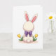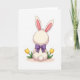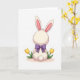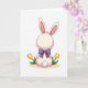 Cette carte présente un lapin stylisé 🐰 dans des tons de crème doux, vu de derrière alors qu'il est assis au centre sur un fond blanc éclatant. Ses longues oreilles se tendent vers le haut avec des détails intérieurs rose pâle, donnant à la petite silhouette un air timide et affectueux, comme s'il attendait quelqu'un juste hors de vue. Un nœud violet foncé soigneusement noué repose sur son dos, ajoutant une touche romantique comme un ruban de cadeau gardé pour un ami spécial. Juste en dessous, une petite queue blanche duveteuse apparaît, arrondissant la forme avec un charme doux. Deux fleurs jaunes en forme de tulipes 🌷 se dressent de chaque côté, avec des tiges et des feuilles vertes qui encadrent le lapin comme une étreinte printanière silencieuse. Tout texte de vœux serait placé près du bas dans une teinte grise douce ou un violet atténué, gardant l'attention sur