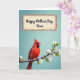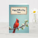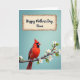 Cette carte présente un oiseau chanteur rouge saisissant avec une haute crête perché sur une branche en fleurs dans le coin inférieur gauche, comme s'il faisait une pause pour partager un moment de calme ❤️. Ses plumes écarlates se fondent dans des rouges plus profonds le long des ailes et de la queue, et une marque sombre sur le visage attire l'attention sur son œil vigilant, donnant à la scène une ambiance douce et attentive. L'arrière-plan est d'un ton aqua calme qui ressemble à l'air printanier ouvert, maintenant l'attention sur l'oiseau et les fleurs. Des fleurs blanches avec de petits centres dorés parsèment la branche, avec des feuilles vertes douces nichées autour d'elles, ajoutant une touche fraîche et affectueuse 🌼. Près du haut se trouve un rectangle horizontal d'une couleur parchemin chaud, bordé d'une bordure brune rugueuse qui semble légèrement usée. Le texte de vœux est centré à l'intérieur de ce rectangle avec de l'encre foncée, dans une écriture fluide qui se détache clairement sur la bannière pâle. Des ombrages subtils et une