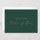 Cette délicate carte d'offre en or et en vert matron d'honneur est parfaite pour un mariage moderne. Le design minimaliste romantique présente une belle et élégante typographie de champagne jaune doré sur un arrière - plan vert émeraude à l'allure simple et épurée. Customisez la carte avec le nom de la mariée et le matron d'honneur. Personnalisez le dos de la carte avec un message personnalisé.