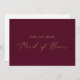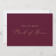 Cette carte d'honneur en or délicat et en bordeaux est parfaite pour un mariage moderne. Le design minimaliste romantique présente une belle et élégante typographie de champagne jaune doré sur un arrière - plan rouge bordeaux à l'allure simple et épurée. Customisez la carte avec le nom de la mariée et la bonne d'honneur. Personnalisez le dos de la carte avec un message personnalisé.