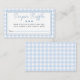 Améliorez votre baby shower avec cette charmante carte de tombola en vichy bleue, parfaitement en accord avec notre invitation de baby shower garçon. Il est éditable et personnalisé pour s'adapter à votre célébration, apportant une touche d'élégance à votre événement. Encouragez les invités à se joindre à la fête avec ce délicieux ajout!