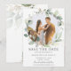 Mettez en valeur votre photo de pré-mariage avec cette carte de rappel photo chic bohème. Avec une belle couronne de feuillage de verdure aquarelle. Personnalisez-la facilement et rapidement avec vos informations, il suffit d'appuyer sur le bouton personnaliser pour réorganiser et formater le style et l'emplacement du texte.