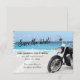 Cette carte de rappel de mariage est parfaite pour tout couple de motards qui souhaite célébrer son amour avec un mariage unique et mémorable. La carte présente une belle illustration d'une moto sur la plage. Le fond est un océan bleu vibrant. La carte est simple mais élégante, et elle laissera certainement une impression durable sur vos invités.
