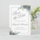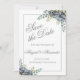 La conception présente un bouquet d'hortensias pourpres avec un bouquet de feuillage d'eucalyptus avec une bordure grise claire. Cela va avec notre collection de faire-part de mariage assortis.