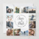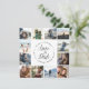 Partagez 12 photos préférées avec cette unique carte de rappel de mariage en forme carrée. Vos photos sont disposées autour d'un élément central avec vos noms, date de mariage et lieu courbés autour de "save the date" en lettrage calligraphique élégant en noir délavé. Le verso des cartes présente des rayures en noir et blanc encrées.