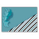 Carte de table avec bandes diagonales en noir, turquoise, bleu et blanc le long du côté droit et du bas de la carte. La partie supérieure gauche est un regroupement de 3 plumes stylisées en coordonnant les couleurs sur un arrière - plan bleu turquoise.