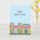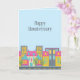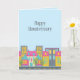 Cartes fantaisistes "Joyeux Anniversaire de Maison" pour le marketing immobilier. Le design présente un quartier urbain mignon sur un fond bleu clair. Parfait pour les agents immobiliers résidentiels, les prêteurs hypothécaires, les agences de titres, les services d'inspection de maisons, etc.