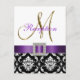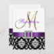 L'élégance sophistiquée est transmise par ce magnifique modèle de carton d'invitation à la réception de mariage. Un motif damassé floral noir et blanc sert de fond à un effet photo de l'initiale M en dorure métallisée et un ruban de satin violet et un broche en diamant TOUT IMPRIMÉ sur un carton plat. Un moyen parfait d'inviter vos invités à votre réception de mariage. Motif damassé contemporain, mais classique avec un design qui vous permet de personnaliser le devant avec vos noms ou le mot "réception" et le verso est libre pour ajouter votre texte personnalisé d'invitation à la réception de mariage. L'invitation à la réception de mariage est prévue pour l'initiale de monogramme "M". Pour d'autres lettres ou couleurs de ruban ou de damassé, veuillez contacter le concepteur à luxuryweddinginvitations@gmail.com. Conception de la mise en page par Elke Clarke