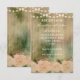 Une élégante invitation de mariage rustique avec fond en bois, roses roses douces, et une guirlande de lumières. Cette invitation de mariage fait partie d'un ensemble complet.