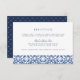 Conçue pour coordonner avec notre collection de faire-part de mariage Santorin à Lapis, cette élégante carte d'enceinte de style méditerranéen présente un carrelage géométrique inspiré de la bordure du fond en bleu lapis croustillant. Ajoutez les détails de votre réception en bleu marine de coordination, y compris le calendrier, le lieu, l'adresse et toute information supplémentaire — comme le transport — en utilisant les champs fournis.