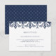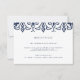Conçue pour coordonner avec nos invitations de mariage et d'événement Marrakech, cette élégante carte de réception en bleu marine et blanc classique présente une bordure supérieure géométrique inspirée du Maroc. Ajoutez vos détails de réception tels que l'heure, le lieu et l'adresse, ainsi que toute information sur le stationnement ou les transports dans un bleu marine assorti.