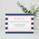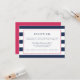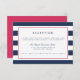 Conçue pour se coordonner avec nos invitations de mariage et d'événement à rayures Metro rose et marine de style preppy chic, cette carte d'information de réception simple et chic présente un fond de larges bandes horizontales dans des tons classiques de bleu marine et de blanc, avec les détails de votre réception de mariage dans un mélange de styles de typographie bloc moderne et script traditionnel en bleu nuit riche. Une fine bordure en rose fuchsia vif ajoute une touche de couleur contrastée. Ajoutez vos informations clés telles que l'heure, le lieu, le transport ou le stationnement en utilisant les champs fournis.