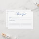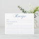 Cette carte de recette de douche nuptiale à script bleu poussiéreux est parfaite pour toute douche. Il a beaucoup de lignes pour les ingrédients et le dos entier est des lignes pour les directions. Inclure une ou deux cartes de recettes avec chaque invitation à la douche demandant aux invités de partager leur(s) recette(s) préférée(s) avec la mariée. Vous serez surpris de la variété des recettes et de la gratitude de la mariée d'avoir un ensemble de recettes éprouvées pour cuisiner pour son marié bien-aimé.
