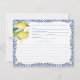Carte recette design orné de citrons aquarelle, de feuilles vert brillant et de carreaux vintages bleu et blanc audacieux pour correspondre à mes modèles d'invitation de douche nuptiale dans la même couleur.