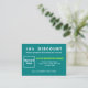 Attirer plus de clients. Convainquez plus de clients à acheter vos produits ou à aimer vos services en offrant des rabais. Faites également de la publicité pour votre entreprise, faites la promotion de votre marque ou faites de la sensibilisation à votre marque. Customisez cette carte de réduction en spécifiant la remise en pourcentage que vous offrirez, la date de validité, le téléchargement du logo de votre entreprise, en tapant votre nom d'entreprise ou d'entreprise, votre adresse et votre numéro de téléphone. La couleur de la carte de réduction est turquoise et les couleurs de police sont jaune vert et blanc. Veuillez vérifier l'apparence après avoir téléchargé le logo et tapé des textes. Si l'apparence vous plaît, vous pouvez passer votre commande maintenant. Si vous avez besoin de redimensionner et déplacer le logo et les textes pour s'adapter à cette carte de réduction ou à d'autres formes et tailles que vous choisirez, veuillez modifier dans l'outil de conception. Vous pouvez également effectuer d'autres modifications en fonction de vos préférences dans l'outil de conception, comme modifier la couleur de la carte de réduction, la couleur de police, le style de police, modifier des textes, ajouter des textes et supprimer des textes.