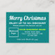 Joyeux Noël! Une des fêtes les plus célèbres de l'année. C'est aussi l'une des meilleures saisons pour annoncer votre entreprise ou pour promouvoir votre marque auprès de clients ou clients. Attirer plus de clients en leur donnant remise, l'une des stratégies marketing pour avoir plus de clients. Carte de réduction personnalisable que vous pouvez utiliser pour attirer plus de clients pour acheter vos produits ou clients à aimer vos services. Carte de réduction avec votre marque d'entreprise comme matériel de marketing que vous pouvez également utiliser pour sensibiliser la marque. Carte de réduction pour décembre ou Noël en juillet. Les couleurs design sont des textes blancs et jaunes-verts sur arrière - plan vert turquoise. Pour customiser cette carte d'escompte, spécifiez le pourcentage de remise que vous proposerez et la date de validité. Téléchargez également votre logo d'entreprise, tapez votre nom d'entreprise, votre adresse et votre numéro de téléphone. Veuillez vérifier l'apparence sur les côtés avant et arrière après avoir téléchargé le logo et tapé des textes. Si l'apparence vous plaît, vous pouvez passer votre commande maintenant. Si vous avez besoin de redimensionner et déplacer le logo et les textes pour s'adapter à cette carte de réduction, s'il vous plaît changer dans l'outil de conception. Vous pouvez également modifier la couleur arrière - plan, la couleur de police et le style de police dans l'outil de conception. Joyeux Noël! Je vous souhaite plus de ventes ce jour férié.