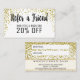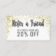 Moderne et fascinant les parties scintillantes tachetées par or imprimées ce par faux sur le blanc, se réfèrent un ami que la carte de référence de remise est parfaite pour l'entrepreneur à la mode et élégant. Cette carte de regard à la mode et professionnelle est la manière parfaite de montrer vos clients que vous vous inquiétez de leurs affaires. Customisez cette carte pour n'importe quelles affaires, juste éditez le texte et ajoutez vos propres détails personnels.