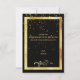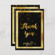 Un fond de couleur noire et un cadre doré faux. Avec une pluie de confettis dorés. Sur le devant, un style de lettrage manuscrit et le texte : Merci ! et un décor floral doré faux. Dos : Modèle pour votre note de remerciement et nom/noms