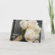 Une carte de remerciement présentant une photo d'un bouquet de roses blanches enveloppées de ficelle de jute reposant sur un fond de bois de grange. Le texte sur le devant dit "Merci". L'intérieur est vierge. Cette carte peut également être achetée en format carte de vœux plus petite. Recherchez des invitations de mariage assorties et plus encore chez Jill's Paperie.