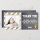 Carte de remerciement d'anniversaire mignonne pour remercier vos invités. La carte a un motif d'ourson mignon et un petit ourson. Personnalisez la carte avec votre photo et votre nom. Vous pouvez également modifier le texte de remerciement et écrire le vôtre. Le texte est de couleur blanche tendance et moderne. Le fond est une texture de tableau noir gris moderne. Thème ourson.