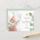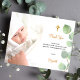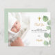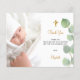 Une carte de remerciement de baptême moderne et élégante. Un fond blanc chic orné de feuillage d'eucalyptus. Personnalisez et ajoutez votre photo de l'enfant, votre note de remerciement et son nom. Mixte.