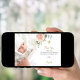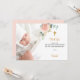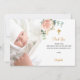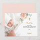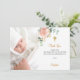 Une carte de remerciement de baptême moderne et élégante. Un fond blanc chic orné de fleurs aquarellées rose blush, de fleurs dorées roses, de verdure d'eucalyptus et de feuilles dorées fausses. Personnalisez et ajoutez votre photo de l'enfant, votre note de remerciement et son nom.