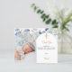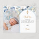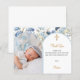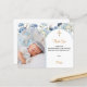 Ajoutez une photo en taille verticale. Un cadre photo en forme d'arche bleue. Décoré de fleurs bleues. Un fond de couleur blanche. Personnalisez et ajoutez un nom et des détails.