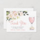 Cette carte de remerciement présente un verre à vin en rose doré avec des fleurs roses. C'est parfait pour un week-end de fête de douche de mariée dans un vignoble ou un domaine viticole.