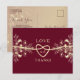 Exprimez votre gratitude avec une élégance rustique en utilisant notre carte de remerciement de mariage bordeaux bohème chic. Avec un cœur de corde dorée charmant, une délicate dentelle florale dorée et un script de calligraphie moderne, c'est le moyen idéal pour exprimer vos sincères remerciements à vos proches.
