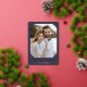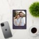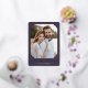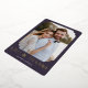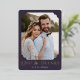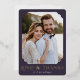 Élégante carte de remerciement de mariage avec feuille d'or avec un cadre unique pour votre photo de choix, typographie moderne et fond violet foncé. Personnalisez ce modèle de remerciement de mariage avec vos noms et message personnel au dos.