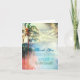 carte de remerciement de mariage sur la plage avec ombre corail bleu aquarelle et guirlande lumineuse suspendue aux palmiers.