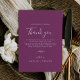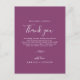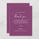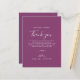 Cette carte de remerciement de réception minimale feuille baie violette est parfaite pour un mariage bohème. Le design présente une silhouette de feuille de verdure simple dans une couleur violet été romantique avec un style de jardin bohème minimaliste. Placez ces cartes sur le réglage de table pour chacun de vos invités à votre réception de mariage. Personnalisez la carte avec vos noms et un message de remerciement spécial.