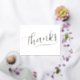 Une simple, mais élégante minimaliste carte Merci avec "Merci" en script de papier peint avec un swash en dessous. Trois options de couleur de feuille. Vous pouvez customiser la couleur avant à une couleur qui, selon vous, montre bien l'impression du papier et customiser le dos comme une carte postale (garder le séparateur) ou enlever le séparateur, utiliser le dos entier pour envoyer du courrier dans l'enveloppe. (Assurez-vous de sélectionner l'option d'enveloppe sur la page du produit, le cas échéant, ou vous n'obtiendrez aucune enveloppe.)