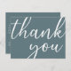 Un fond gris ardoise. Sur le devant, un grand texte manuscrit avec la mention : Merci. Dos : Modèle pour votre note de remerciement et nom/noms. Astuce : Si vous ne voulez pas que cela ressemble à une carte postale, cliquez sur personnaliser, allez à l'arrière et supprimez le séparateur et le timbre-poste.