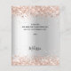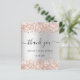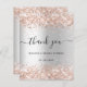 Une carte de remerciement pour un enterrement de vie de jeune fille. Un fond métallisé argenté faux. Avec de la poussière de strass rose doré. Sur le devant, un grand texte manuscrit et le texte : Merci, votre texte, titre et une date.