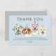 Jolie carte de remerciement à envoyer après la fête d'anniversaire sur le thème du chiot de votre enfant. Cette carte contient déjà du texte que vous pouvez utiliser tel quel ou modifier facilement en ligne. Illustration de 4 chiens (dalmatien, beagle, terrier pitbull) avec des chapeaux de fête avec le texte "merci" au-dessus d'eux.